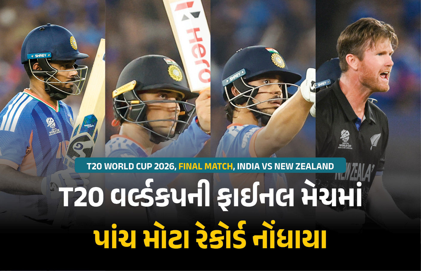 T20 World Cup 2026 Final Record : અમદાવાદના નરેન્દ્ર મોદી સ્ટેડિયમમાં ટી20 વર્લ્ડકપની ફાઈનલ મેચમાં અનેક રેકોર્ડ નોંધાયા છે. મેચમાં ભારતે 20 ઓવરમાં પાંચ વિકેટે 255 રન નોંધાવ્યા છે, જે ટી20 વર્લ્ડકપના ઈતિહાસમાં સૌથી મોટો સ્કોર છે. આ ઉપરાંત ફાઈનલ મેચમાં ટોચના ત્રણ બેટરોએ ફિફ્ટી ફટકારી હોય, તેવું ટી20 વર્લ્ડકપમાં પહેલીવાર બન્યું છે. અન્ય રેકોર્ડની વાત કરીએ તો એક જ ઓવરમાં ત્રણ વિકેટ પડી હોય તેવું પણ પહેલીવાર બન્યું છે.